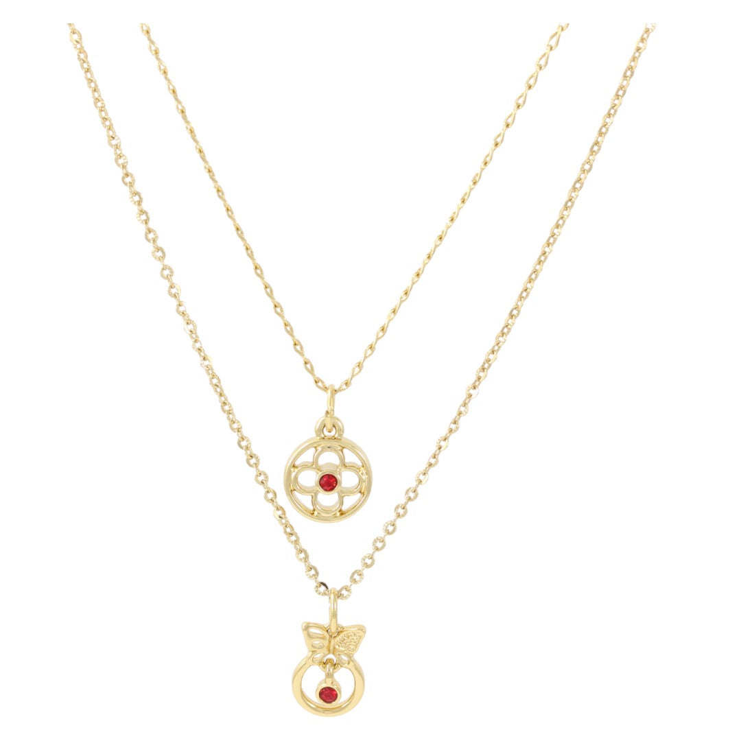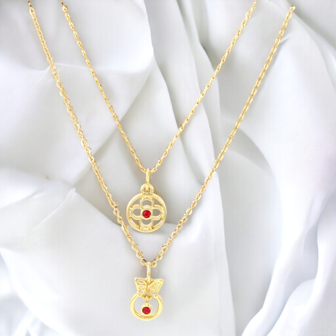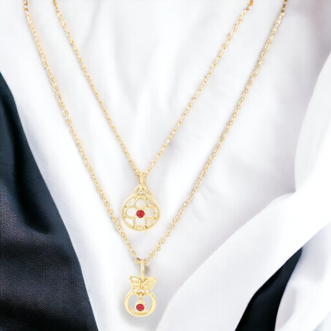 Double chain Flower & Butterfly with Red Zirconia Necklace Real Gold Plated 24k