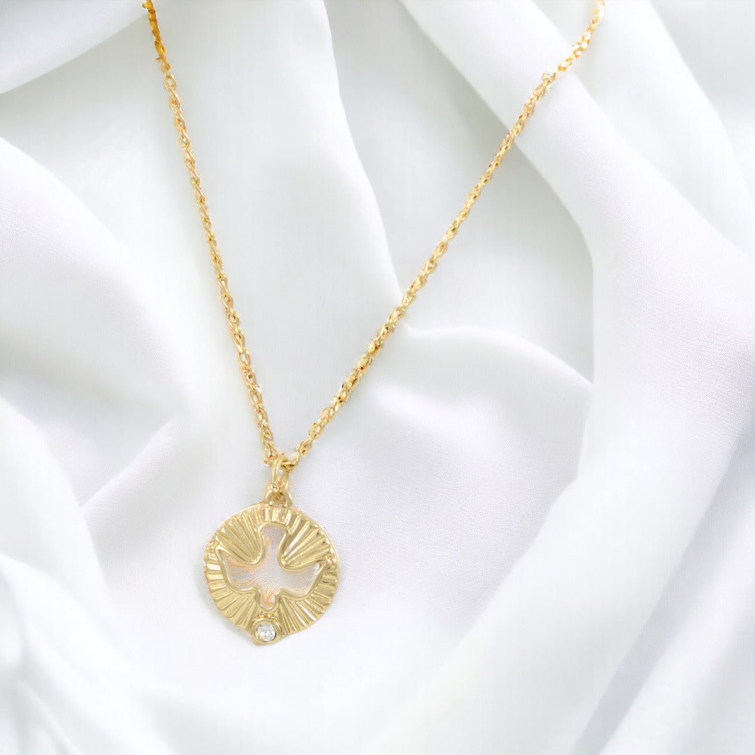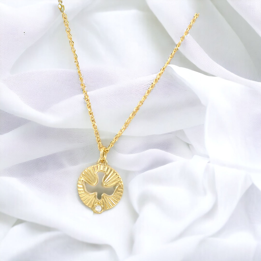Adorn your neckline with the symbol of the Holy Spirit, representing the divine presence, guidance, and spiritual connection. The intricately designed pendant brings a sense of sacredness and grace to your ensemble.