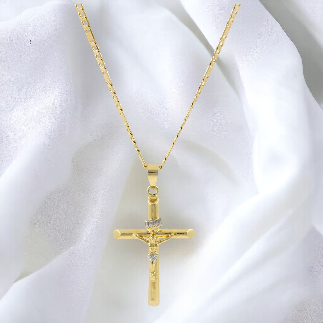 Crucifix Cuban Figaro Chain 20" Necklace Real Gold Filled 18K