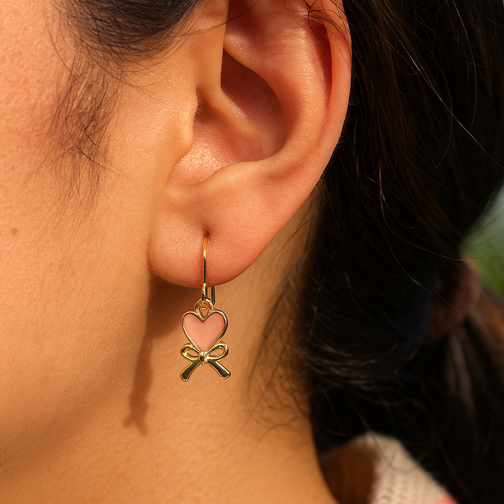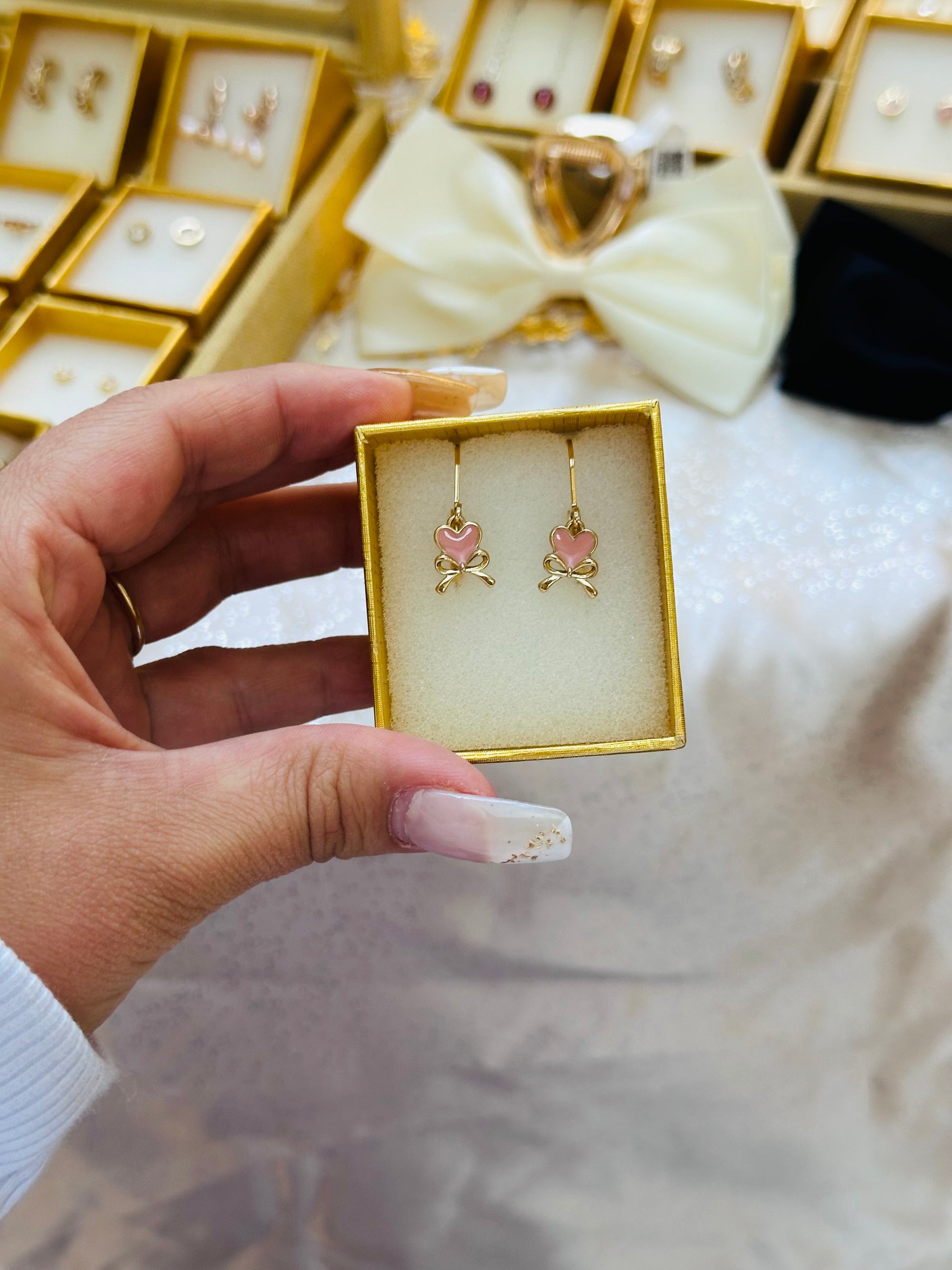 Pink Heart an bow dangle earrings 24K Gold Plated