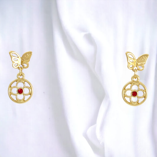 Butterfly with red Zircons Drop Earrings Gold Plated 24K