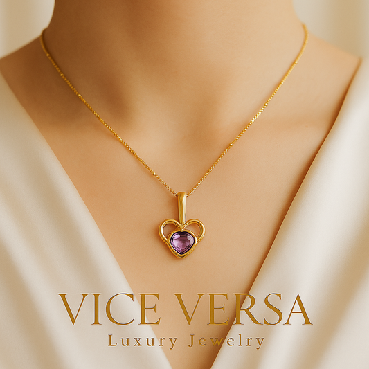 Two Hearts Purple Zircon Necklace Real Gold Plated 24K