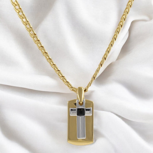 Tag Plate Men's Cross Gold & Black Necklace Gold Plated 24K